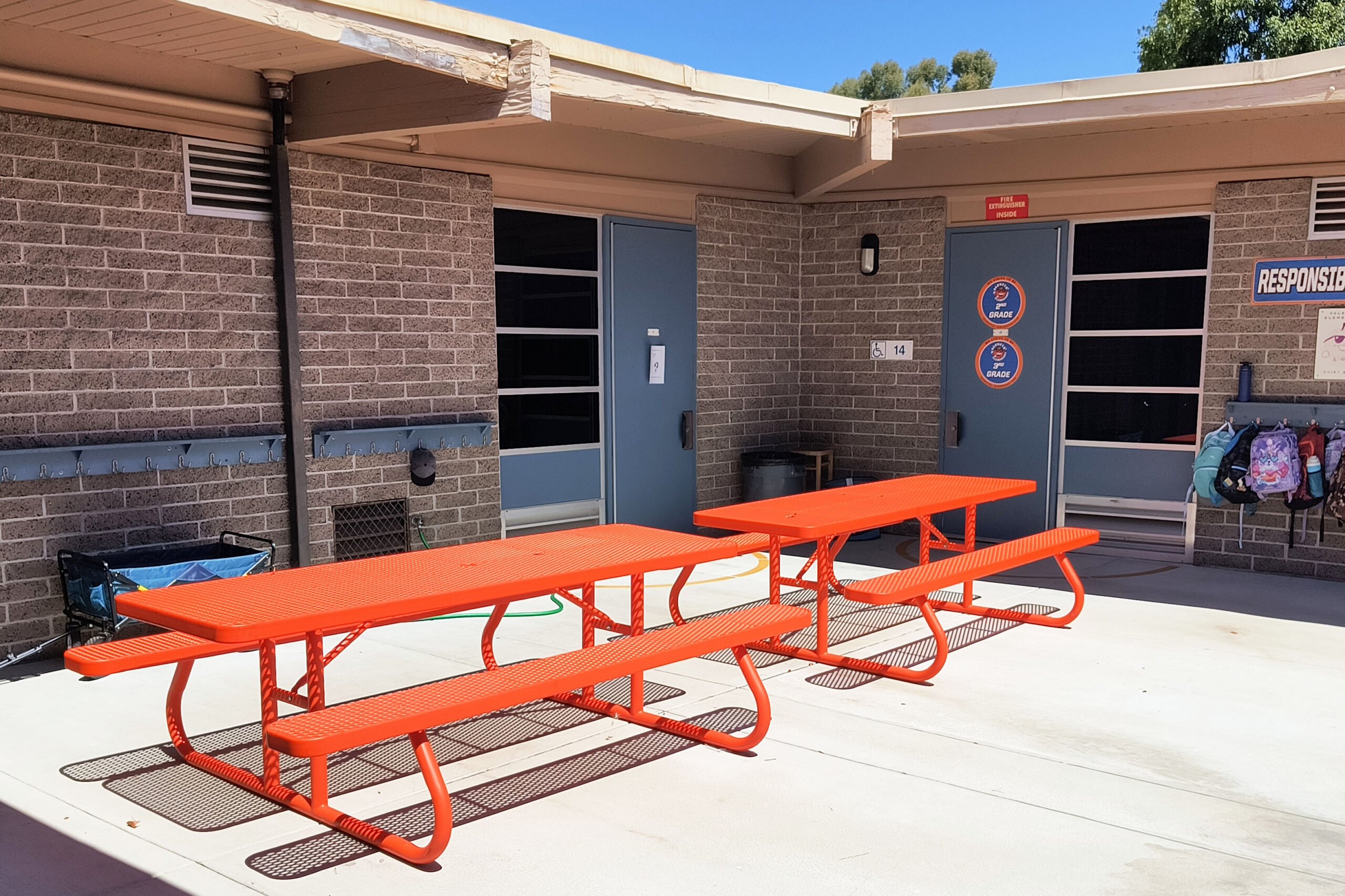 • Kids Picnic TablesCommercial Kids Picnic Tables Built To Last A Lifetime In ALL Climates! The Premier Advantage: Commercial Kid’s Picnic Tables built with Durability and Stability that look good and are manufactured to last a lifetime in ALL climates. The Champion Series of Kid’s Picnic Tables are purposely designed to be fun, durable, and safe. • Accidently tipping the table is next to impossible due to the sturdy frame design. • The poly-vinyl coated pipe has no openings that would allow access to bees and other insects. • A tough poly-vinyl coating meets worldwide safety standards. • Quality was not spared on Premier Polysteel Kids! Premier Polysteel’s completely poly-vinyl coated steel picnic tables are specially designed to withstand even the toughest of conditions. The tough coating provides a UV stable and mold resistant surface. Every part of the picnic table is covered so it will never rust. Twelve standard colors are offered. So mix and match your favorite colors for a fun look! Scroll through the color options to find just the color combination you love. The seats and tops are available in either coated expanded metal (diamond pattern) or perforated (punched) steel. Learn More About Our Children’s Tables